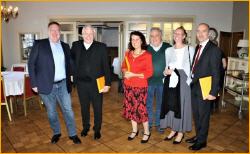 Von links: Kassierer Christian Freese, Bischof Heinrich Timmerevers und die vier Gäste aus Dresden, Martina Weser, Andreas Weser, Maria Dvorak und Steffen Dvorak |