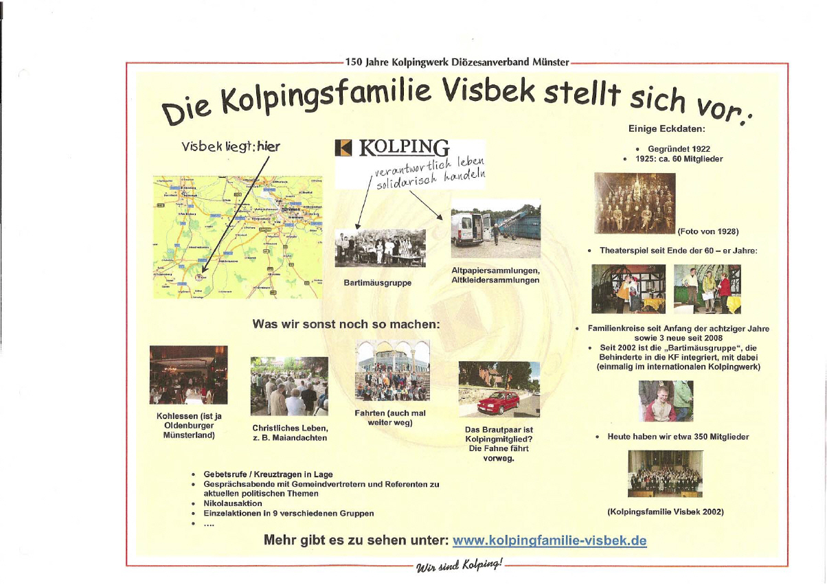 Im Jahre 1922 wurde auch in Visbek das Werk Vater Kolpings aufgenommen. Fast alle schriftlichen Unterlage aus dem Leben und der Arbeit der Kolpingfamilie sind im Jahre 1936 der Gestapo zum Opfer gefallen.